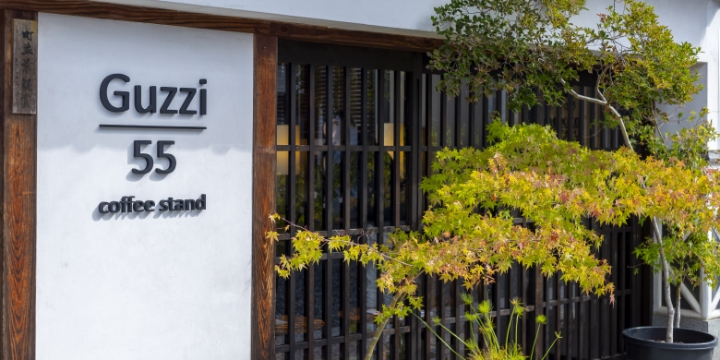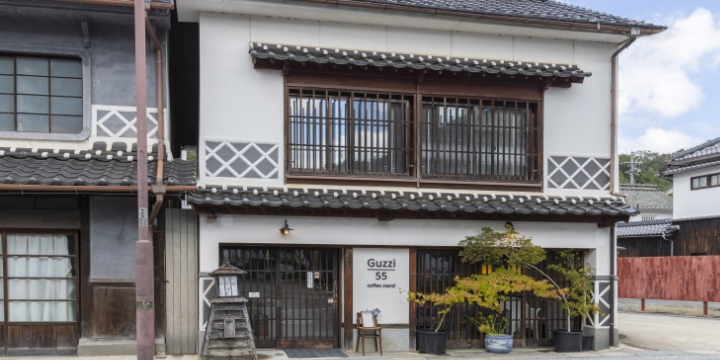 白壁通りに佇むコーヒースタンド「Coffee stand Guzzi_55 / 福場焙煎所」。焙煎する豆の豊かな香りが、町ゆく人の足を静かに止めます。定年を機に上下町にUターンし、この店を始めた店主の福場豊さんの願いは、「商店街に明かりを灯すこと」。今日もグッチに明かりが灯り、訪れる人を迎えています。